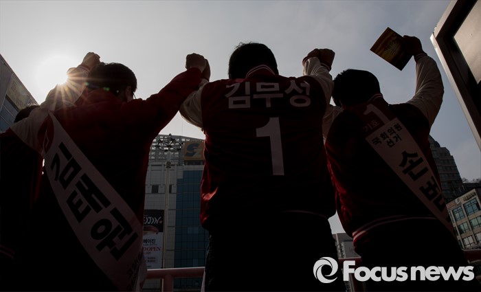 (고양=포커스뉴스) 8일 오후 경기 고양시 화정역 광장에서 손범규 새누리당 고양갑, 김태원 고양을 후보 합동지원유세를 가진 김무성 대표가 유권자들의 지지를 호소하고 있다.