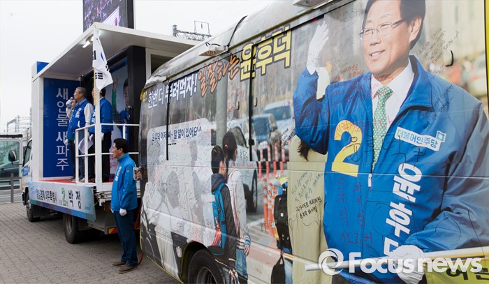 (파주=포커스뉴스) 김종인 더불어민주당 비대위 대표 겸 선대위원장이 8일 오후 경기 파주 금촌역 앞에서 윤후덕 파주시갑 후보와 박정 파주시을 후보 합동지원유세를 하고 있다.