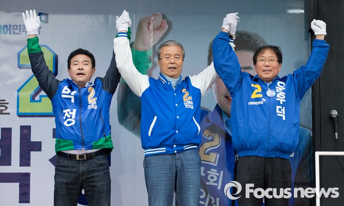(파주=포커스뉴스) 김종인(가운데) 더불어민주당 비대위 대표 겸 선대위원장이 8일 오후 경기 파주 금촌역 앞에서 윤후덕(오른쪽) 파주시갑 후보와 박정(왼쪽) 파주시을 후보 합동지원유세를 하고 있다.