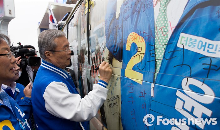 (파주=포커스뉴스) 김종인 더불어민주당 비대위 대표 겸 선대위원장이 8일 오후 경기 파주 금촌역 앞에서 윤후덕 파주시갑 후보와 박정 파주시을 후보 합동지원유세를 마치고 윤 후보 선거캠프 차량에 응원 문구를 작성하고 있다.