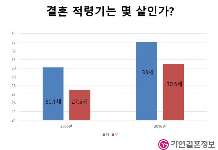 조사 결과에 따르면, 결혼적령기는 2006년과 비해 올해가 3년 더 늦어졌다. "몇 살에 결혼하는 것이 가장 좋은가"라는 질문에 남자는 33.0세, 여자는 30.5세라고 답했다. 이는 2006년 30.1세, 27.5세보다 각각 2.9세, 3.0세 높아진 수치다.