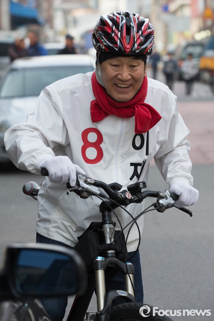 (서울=포커스뉴스) 이재오 무소속 은평을 후보가 8일 오후 서울 은평구 갈현동 일대에서 자전거를 타며 골목 유세를 다니고 있다.