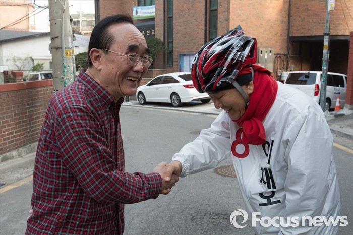 (서울=포커스뉴스) 이재오 무소속 은평을 후보가 8일 오후 서울 은평구 갈현동 일대에서 골목 유세를 하며 시민과 악수하고 있다.