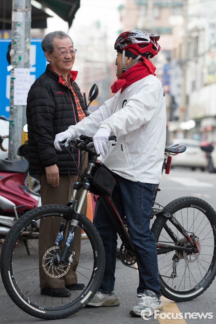 (서울=포커스뉴스) 이재오 무소속 은평을 후보가 8일 오후 서울 은평구 갈현동 일대에서 자전거를 타며 골목 유세를 다니고 있다.