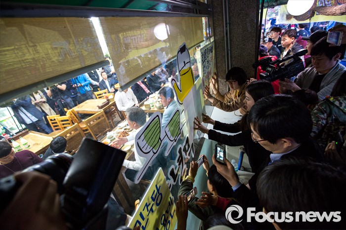 (광주=포커스뉴스) 8일 오후 광주광역시 광산구 월곡시장 인근 막걸리집에서 문재인 더불어민주당 전 대표가 지역 4050 주민들과 간담회를 진행하자 음식점 외부에 모인 지지자들이 문 전 대표를 응원하는 피켓을 들고 있다.