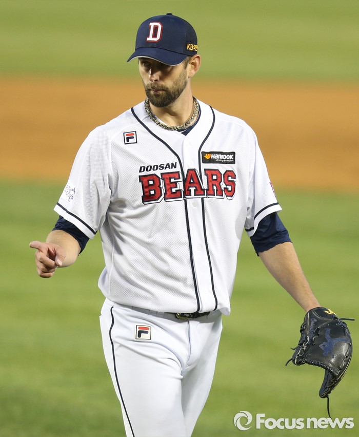 (서울=포커스뉴스) 8일 서울 잠실구장에서 열린 2016 프로야구 넥센-두산 경기 2회초 2사 2루에서 두산 투수 니퍼트가 넥센 박동원을 삼진으로잡고 이닝을 마치며 포수 양의지를 향해 격려의 손짓을 하고 있다.