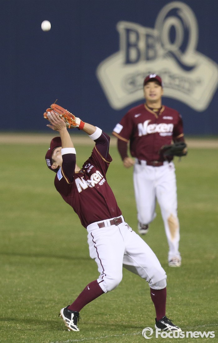 (서울=포커스뉴스) 8일 서울 잠실구장에서 열린 2016 프로야구 넥센-두산 경기 5회말 2사후 넥센 2루수 서건창이 두산 양의지의 좌익수 앞 뜬공을 잡고 있다.