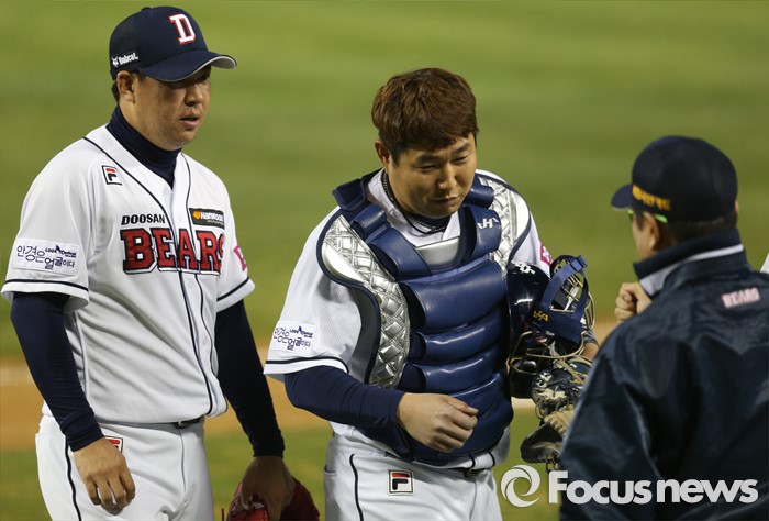 (서울=포커스뉴스) 8일 서울 잠실구장에서 열린 2016 프로야구 넥센-두산 경기에서 넥센에 6-4로 승리한 두산 이현승, 양의지가 김태형 감독과 주먹을 마주치고 있다.