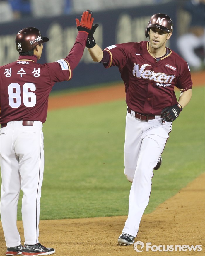 (서울=포커스뉴스) 8일 서울 잠실구장에서 열린 2016 프로야구 넥센-두산 경기 7회초 넥센 선두타자 대니 돈이 우월 1점 홈런을 치고 3루를 돌며 정수성 코치와 하이파이브하고 있다.