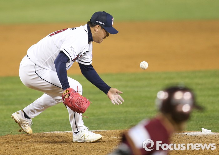 (서울=포커스뉴스) 8일 서울 잠실구장에서 열린 2016 프로야구 넥센-두산 경기 9회초 2사 1,2루에서 두산 투수 이현승이 넥센 임병욱의 투수앞 땅볼을 잡고 있다.