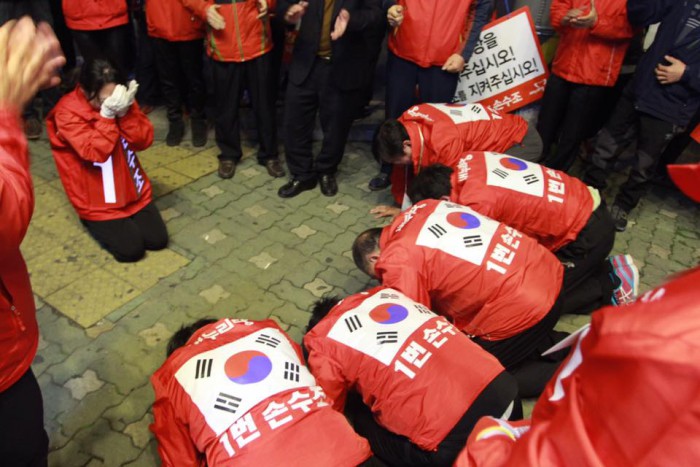 (서울=포커스뉴스) 부산 사상구 구의원 6명이 8일 이 지역에 출마한 손수조 새누리당 후보를 돕기 위해 삼보일배(三步一拜)를 진행했다.