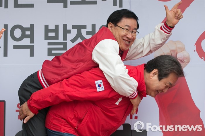 (원주=포커스뉴스) 제20대 국회의원 선거를 나흘 앞둔 9일 오전 강원도 원주시 치악로 남부시장 앞에서 김무성(오른쪽) 새누리당 대표가 김기선 원주갑, 이강후(왼쪽) 원주을 후보 지원유세에 참석해, 이 후보를 업고 있다.