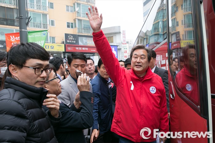 (원주=포커스뉴스) 제20대 국회의원 선거를 나흘 앞둔 9일 오전 강원도 원주시 치악로 남부시장 앞에서 김무성(오른쪽) 새누리당 대표가 김기선 원주갑, 이강후 원주을 후보 지원유세 마친 뒤, 손을 흔들고 있다.