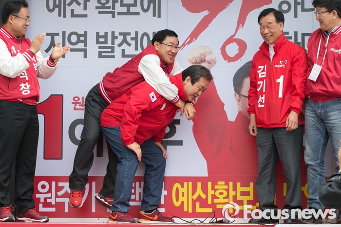 (원주=포커스뉴스) 제20대 국회의원 선거를 나흘 앞둔 9일 오전 강원도 원주시 치악로 남부시장 앞에서 김무성(가운데) 새누리당 대표가 김기선(오른쪽 두번째) 원주갑, 이강후(왼쪽 두번째) 원주을 후보 지원유세에 참석해, 이 후보를 업고 있다.