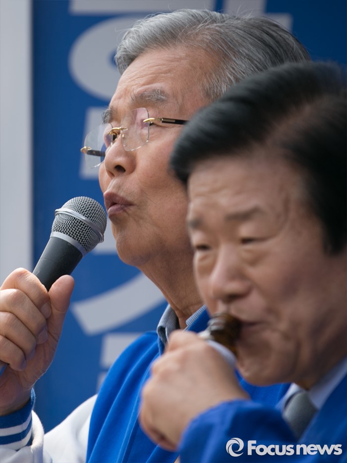 (대전=포커스뉴스) 9일 오후 대전 서구 도마네거리에서 김종인(왼쪽) 더불어민주당 비대위 대표 겸 선대위원장이 박병석 대전서구갑 후보의 지원유세 중 지지를 호소하고 있다.