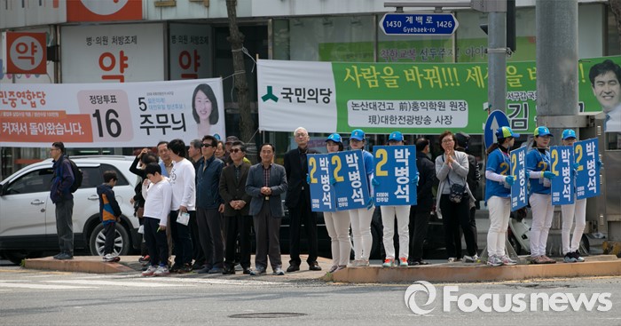 (대전=포커스뉴스) 9일 오후 대전 서구 도마네거리에서 유권자들이 박병석 더불어민주당 대전서구갑 후보의 선거유세를 지켜보고 있다.