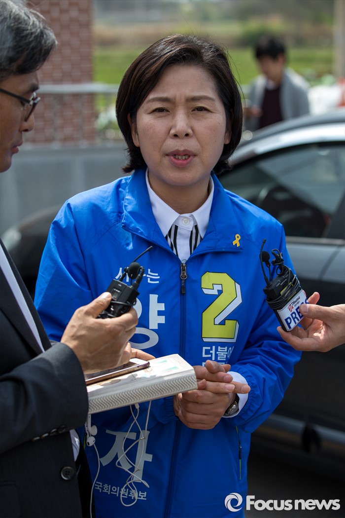 (광주=포커스뉴스) 양향자 더불어민주당 광주광역시 서구을 후보가 9일 오전 광주광역시 서구 발산마을회관에서 취재진과 인터뷰 하고 있다.