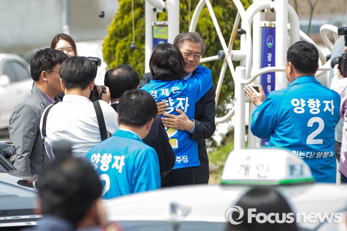 (광주=포커스뉴스) 문재인 더불어민주당 전 대표와 양향자 더불어민주당 광주광역시 서구을 후보가 9일 오전 광주광역시 서구 발산마을회관 앞에서 포옹 하고 있다.