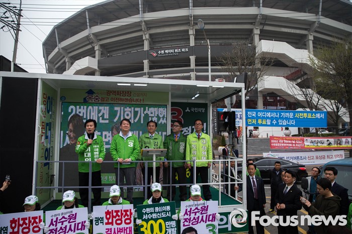 (수원=포커스뉴스) 9일 오후 수원시 장안구 수원종합운동장에서 열린 국민의당 합동유세에 참석한 안철수 대표가 후보자들과 함께 유세차량에 올라가 있다.