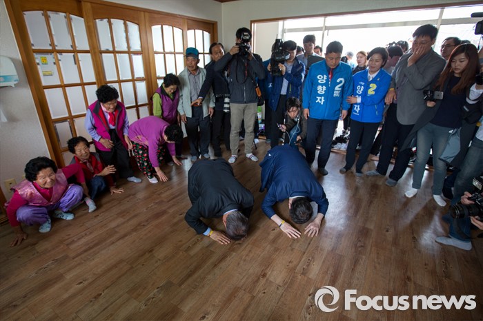 (광주=포커스뉴스) 문재인 더불어민주당 전 대표와 김홍걸 국민통합위원장이 9일 오전 광주광역시 서구 발산마을회관을 방문해 어르신들에게 큰절 하고 있다.