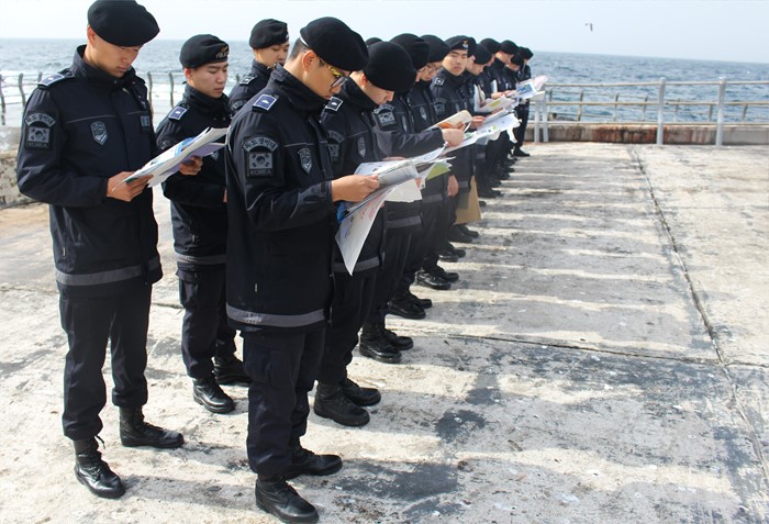 (서울=포커스뉴스) 9일 오전 경북 울릉군 독도에서 독도경비대원들이 제20대 국회의원 선거 거소투표를 하기 전 후보 안내문을 보고 있다. <사진제공=경북지방경찰청>