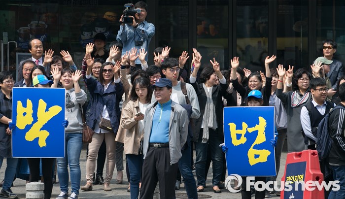 (대전=포커스뉴스) 9일 오후 대전 갤러리아백화점 타임월드점 앞에서 시민 및 지지자들이 더불어민주당 대전 서구 합동유세를 지켜보고 있다.