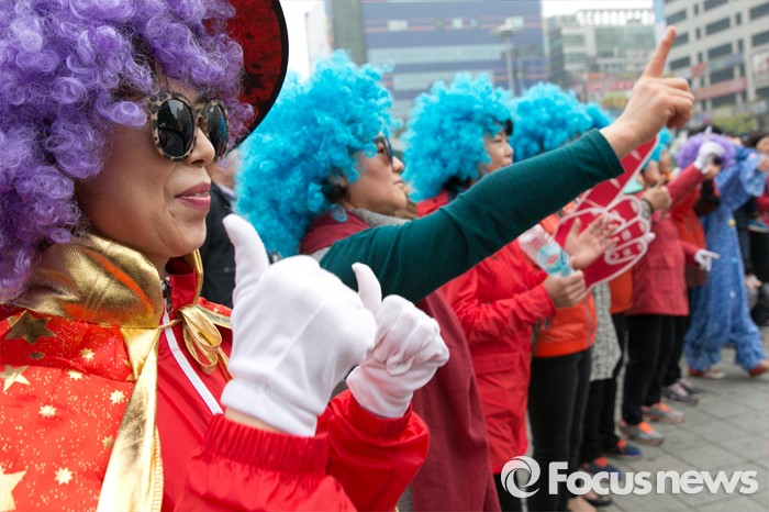 (성남=포커스뉴스) 제20대 국회의원 선거를 나흘 앞둔 9일 오후 성남시 분당구 야탑역 광장에서 새누리당 선거운동원들이 율동을 하고 있다.