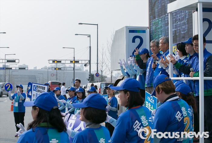 (세종=포커스뉴스) 9일 오후 세종시 국립세종도서관 앞에서 김종인 더불어민주당 비대위 대표 겸 선대위원장과 문흥수 세종시 후보가 선거유세를 하고 있다.