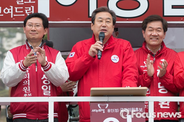 (용인=포커스뉴스) 제20대 국회의원 선거를 나흘 앞둔 9일 오후 경기도 용인시 기흥구 죽현마을 중앙공원에서 김무성(가운데) 새누리당 대표가 이상일(왼쪽) 용인정, 허명환(오른쪽) 용인을 후보 지원유세를 하고 있다.