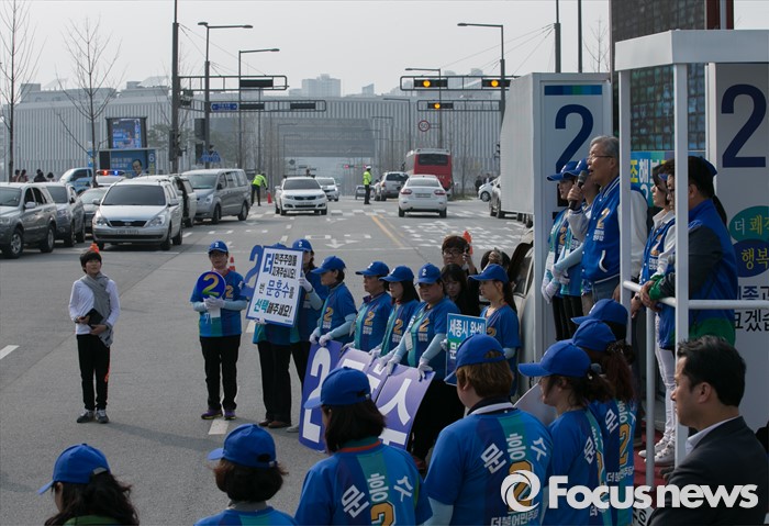 (세종=포커스뉴스) 9일 오후 세종시 국립세종도서관 앞에서 김종인 더불어민주당 비대위 대표 겸 선대위원장과 문흥수 세종시 후보가 선거유세를 하고 있다.