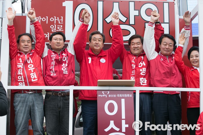 (용인=포커스뉴스) 제20대 국회의원 선거를 나흘 앞둔 9일 오후 경기도 용인시 기흥구 죽현마을 중앙공원에서 김무성(왼쪽 세번째) 새누리당 대표가 이상일(왼쪽 두번째) 용인정, 허명환(오른쪽 세번째) 용인을 후보 지원유세에 참석해, 참석자들과 손을 들고 있다.