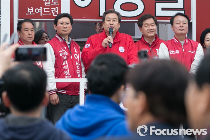 (용인=포커스뉴스) 제20대 국회의원 선거를 나흘 앞둔 9일 오후 경기도 용인시 기흥구 죽현마을 중앙공원에서 김무성(가운데) 새누리당 대표가 이상일(왼쪽 두번째) 용인정, 허명환(오른쪽 두번째) 용인을 후보 지원유세를 하고 있다.