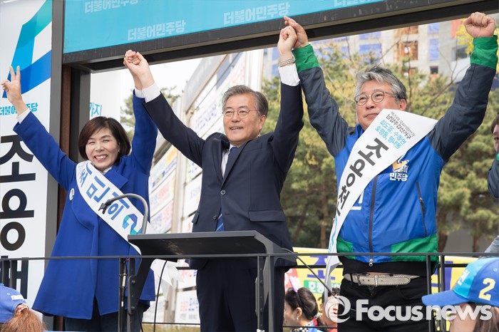 (남양주=포커스뉴스) 문재인 더불어민주당 전 대표가 10일 오전 경기도 이마트 남양주점 인근에서 조응천 더불어민주당 남양주갑 후보, 최민희 더불어민주당 남양주병 후보와 함께 유권자들에게 지지를 호소하고 있다.
