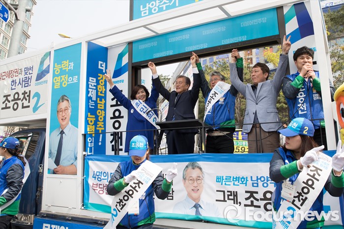 (남양주=포커스뉴스) 문재인 더불어민주당 전 대표가 10일 오전 경기도 이마트 남양주점 인근에서 조응천 더불어민주당 남양주갑 후보, 최민희 더불어민주당 남양주병 후보, 최재성 의원과 함께 유권자들에게 지지를 호소하고 있다.