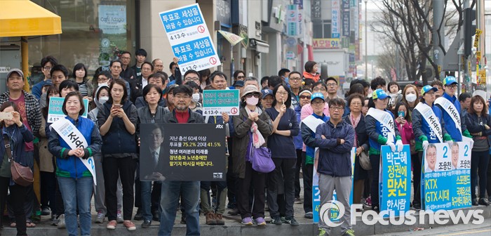 (남양주=포커스뉴스) 10일 오전 경기도 이마트 남양주점 인근에서 시민들이 문재인 더불어민주당 전 대표, 조응천 더불어민주당 남양주갑 후보, 최민희 더불어민주당 남양주병 후보의 지지를 호소를 보고 있다.