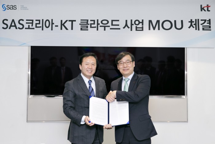 (서울=포커스뉴스) KT는 글로벌 데이터 분석 선두 기업 SAS(쌔스)코리아와 지난 8일 클라우드 사업 업무제휴(MOU)를 체결하고 공공 분야 시장을 확대하기로 했다.
