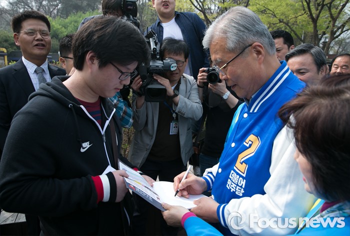 이후 김 대표는 명동성당 앞에 세워진 유세차량에 올랐지만 마이크를 잡지 않으려다 이 후보가 '성당에 양해를 구했다'고 하자 "나라의 장래를 생각해 이번에 경제 심판을 꼭 해달라"며 짧게 지지 발언만 마치고 현장을 떠났다.김종인 더불어민주당 비대위 대표 겸 선대위원장과 전혜숙 광진갑 후보가 10일 오전 서울 어린이대공원 앞에서 한 시민에게 사인을 해주고 있다. 2016.04.10 박동욱 기자