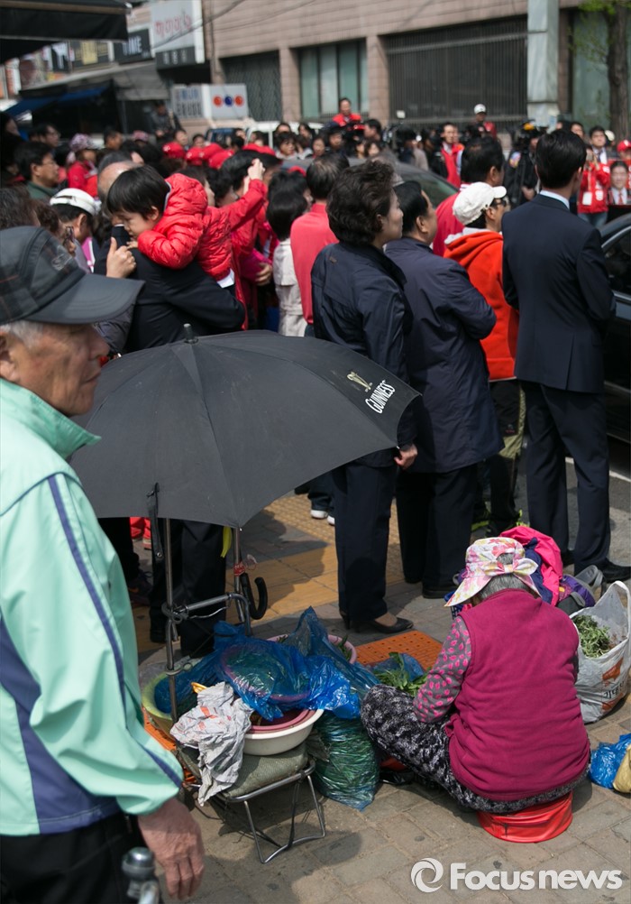 (서울=포커스뉴스) 10일 오전 서울 강동구 양재대로 둔촌시장 앞에서 이재영 새누리당 강동을 후보 유세가 열리는 동안, 한 상인이 장사 준비를 하고 있다.