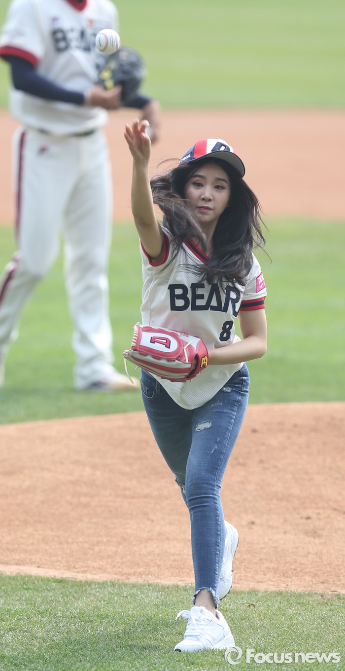 (서울=포커스뉴스) 10일 서울 잠실구장에서 열린 2016 프로야구 넥센-두산 경기에서 걸그룹 피에스타의 차오루가 시구하고 있다.