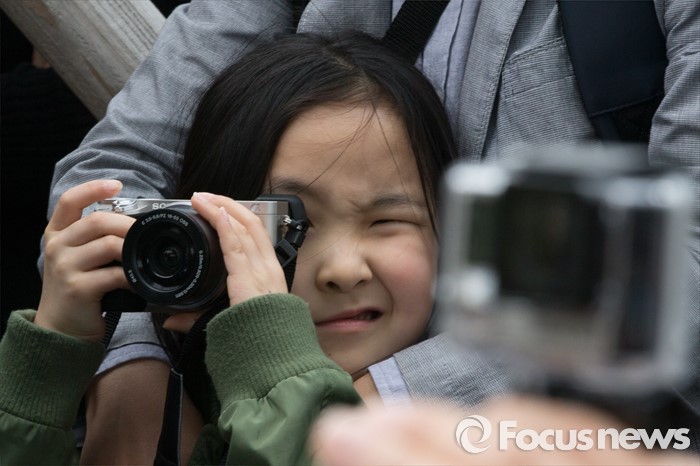 (서울=포커스뉴스) 10일 오후 서울 마포구 홍익대학교 앞에서 한 어린이가 문재인 더불어민주당 전 대표의 손혜원 마포을 후보의 지지호소 모습을 카메라로 담고 있다.