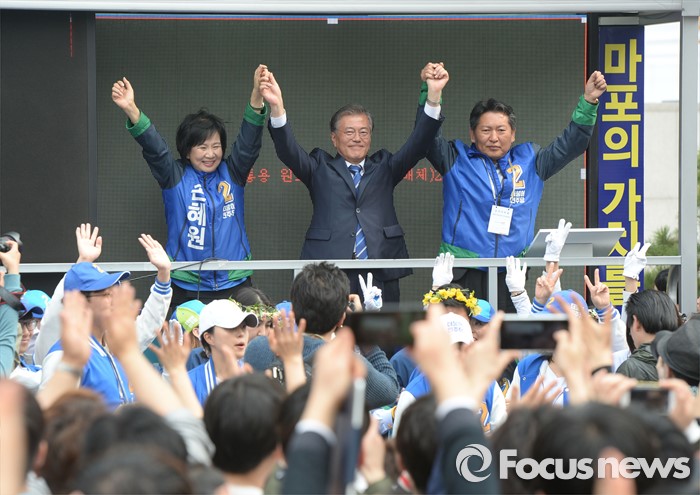 (서울=포커스뉴스) 문재인 더불어민주당 전 대표가 10일 오후 서울 마포구 홍익대학교 앞에서 손혜원 더불어민주당 마포을 후보의 지지를 호소하며 차량으로 향하고 있다.