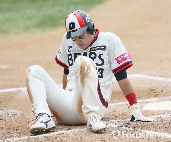 (서울=포커스뉴스) 10일 서울 잠실구장에서 열린 2016 프로야구 넥센-두산 경기 6회말 2사 2루에서 두산 정수빈의 좌전안타때 2루주자 허경민이 홈에서 태그아웃된후 아쉬워하고 있다.