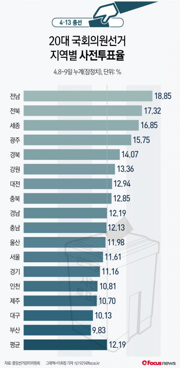 (서울-포커스뉴스) 중앙선거관리위원회 자료에 따르면 8일과 9일 이틀간 진행된 20대 총선 사전투표의 전국 투표율은 12.19%로 잠정 집계됐다. 사전 투표율이 가장 높은 지역은 18.85%의 전라남도였다.