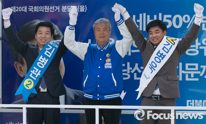 (성남=포커스뉴스) 10일 오후 경기도 성남 미금역 앞에서 열린 더불어민주당 분당 합동유세에 참석한 김종인(가운데) 비대위 대표 겸 선대위원장과 김병관(왼쪽) 분당갑, 김병욱 분당을 후보가 손을 들어 인사하며 지지를 호소하고 있다.