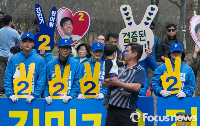 (용인=포커스뉴스) 10일 오후 경기도 기흥구청 인근 거리에서 김민기 더불어민주당 용인을 후보의 선거운동원들이 지지를 호소하고 있다.