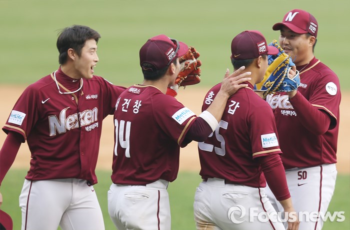 (서울=포커스뉴스) 10일 서울 잠실구장에서 열린 2016 프로야구 넥센-두산 경기에서 두산에 역전승한 넥센 선수들이 마운드에 모여 하이파이브를 하며 승리의 기쁨을 나누고 있다.