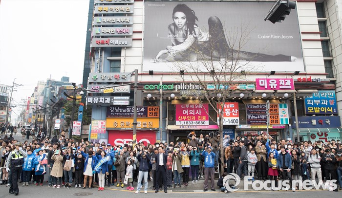 (서울=포커스뉴스) 10일 오후 서울 CGV 강남점 인근에서 시민들이 문재인 더불어민주당 전 대표, 김성곤 강남갑 후보, 전원근 강남병 후보, 이정근 서초갑 후보, 김기영 서초을 후보의 유세를 지켜보고 있다.