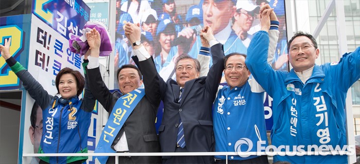 (서울=포커스뉴스) 10일 오후 서울 CGV 강남점 앞에서 이정근(왼쪽부터) 더불어민주당 서초갑 후보, 전원근 강남병 후보, 문재인 전 대표, 김성곤 강남갑 후보, 김기영 서초을 후보와 함께 유권자들에게 지지를 호소하고 있다.