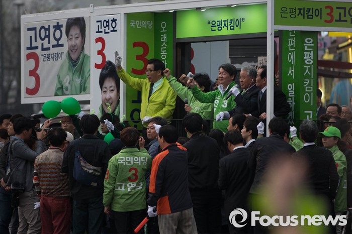 (서울=포커스뉴스) 20대 총선을 사흘 앞둔 10일 오후 서울 은평구 불광역 인근에서 안철수 국민의당 공동대표가 고연호 은평구을 후보와 합동유세를 하고 있다.