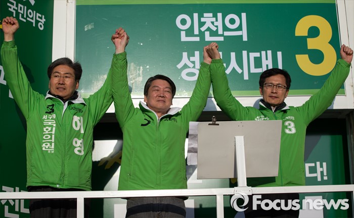 (인천=포커스뉴스) 안철수 국민의당 상임공동대표(가운데)와 인천 서구을 허영, 인천 서구갑 유길종 후보(오른쪽)가 11일 아침 인천시 서구 검암역에서 총선 승리를 다짐하고 있다.